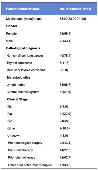 入组患者既往接受过手术、放疗或化疗治疗,其中,78.4%(n=40)的患者为NSCLC患者,男性与女性患者比例相近,21.6%(N=11)的患者出现CNS转移[1]。