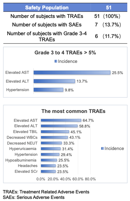 所有受试者均出现治疗相关不良事件(TRAE),最常见的TRAE为AST升高(64.7%)、ALT升高(58.8%)、TBIL升高(45.1%)、WBC降低(43.1%)、NEUT降低(33.3%)、高尿酸血症(31.4%)、高血压(29.4%)、低白蛋白血症(25.5%)、SCr升高(23.5%)和头痛(23.5%)[1]。