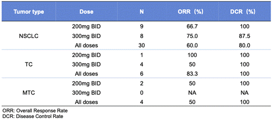 在40例可评估的患者中,独立审查委员会根据RECIST v1.1确认的总缓解率(ORR)和疾病控制率(DCR)分别为62.5%和85%。其中,RET融合NSCLC(n=30)、TC患者(n=6)、MTC患者(n=4)的ORR/DCR分别为60%/80%、83.3%/100%和50%/100。而IRC在 200mg和 300mg(BID)的剂量组中所测定的ORR和DCR分别为 66.7%/100% 和 75%/91.7%[1]。